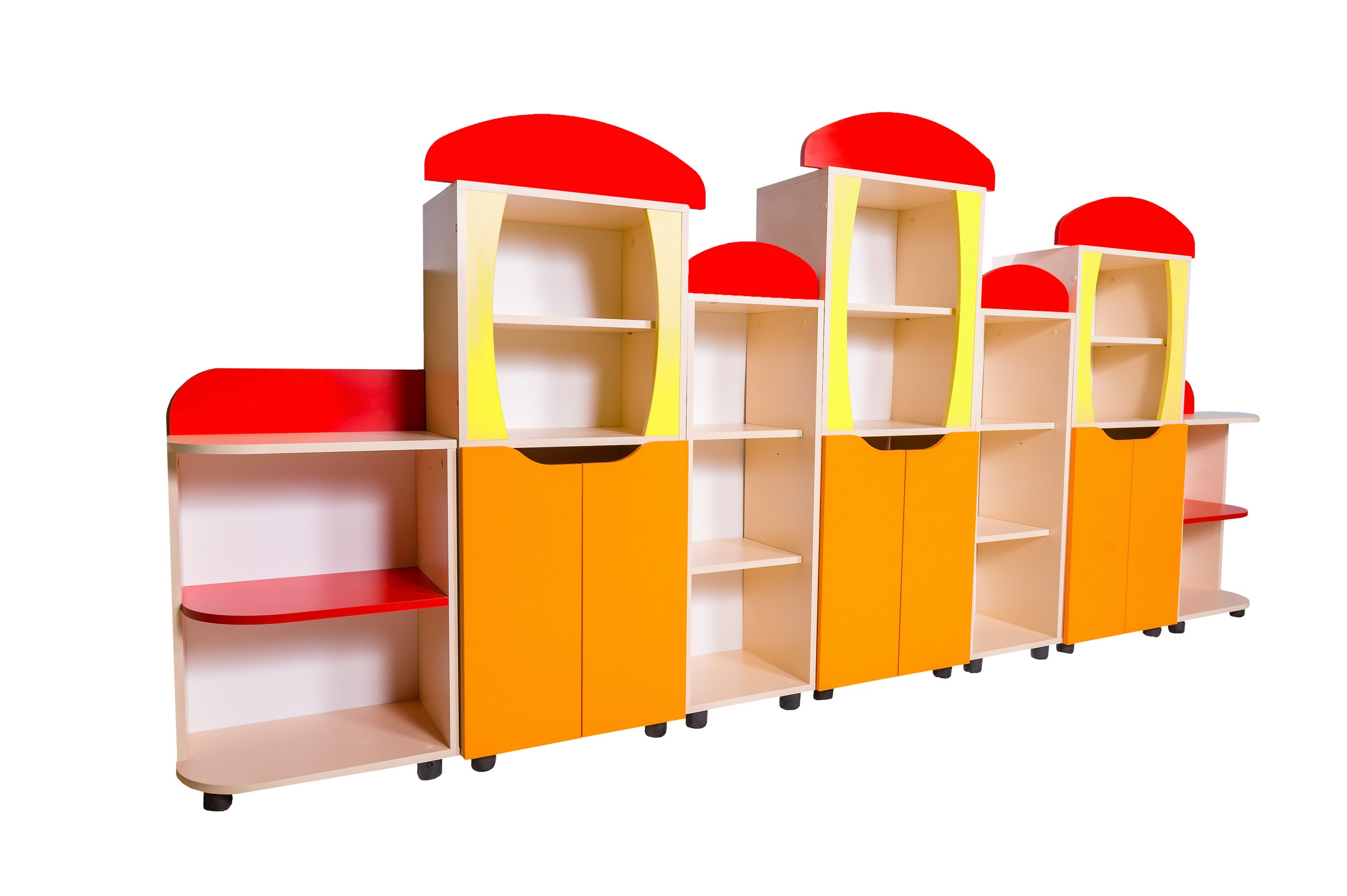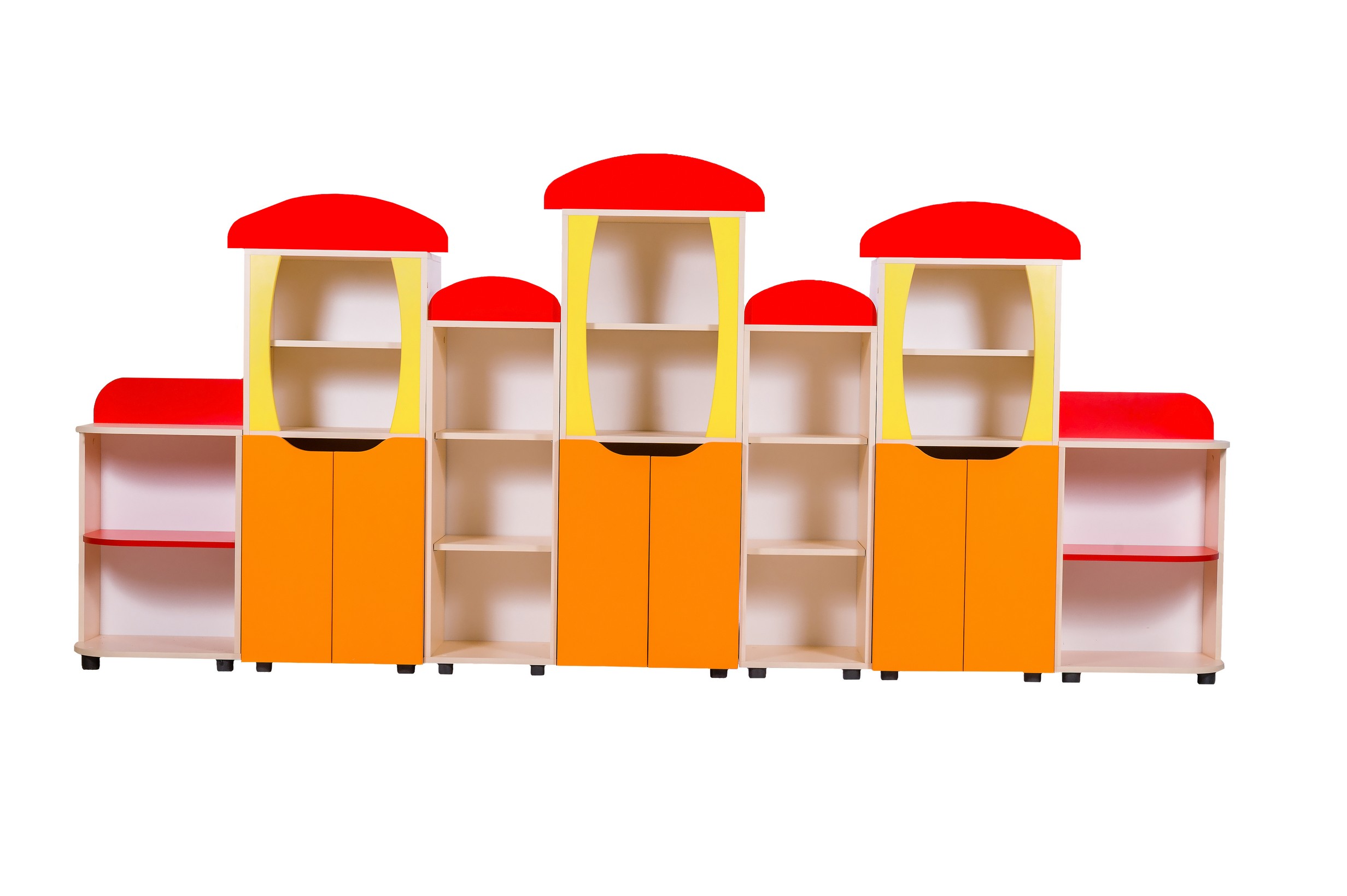 е ниши, полки для хранения игрушек, книг, пособий - Безопасные дверки внизу (вырезы вместо ручек)